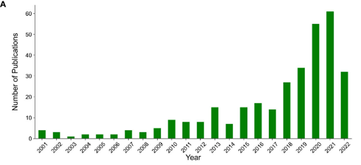 در 5 سال گذشته، تحقیقات بر روی کاربرد کشاورزی ریزجلبک ها رشد زیادی را ثبت کرده است و تعداد مطالعات در سال 2021 در مقایسه با سال 2018 تکرار شده است (شکل 1A). این نشان دهنده ظهور ریزجلبک ها در زمینه کشاورزی است که ممکن است یکی از مرتبط ترین کاربردها در فناوری ریزجلبک ها در سال های بعد باشد (شکل 1B).