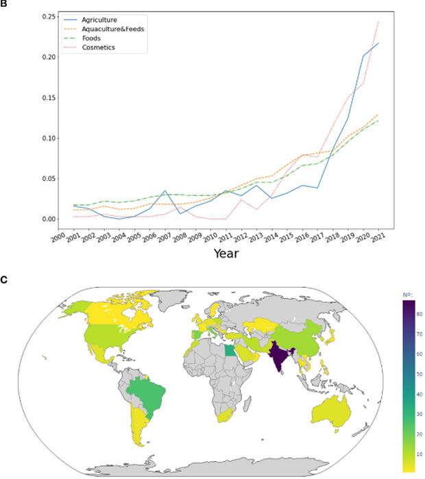 شکل 1 (A) تکامل انتشارات در مورد کاربرد ریزجلبک ها در کشاورزی در سراسر جهان. (B) تکامل انتشارات در مورد کاربردهای مختلف ریزجلبک ها در سراسر جهان و (C) تعداد انتشارات در مورد کاربرد ریزجلبک ها در کشاورزی بر اساس کشور، طی 21 سال (2001-2022).