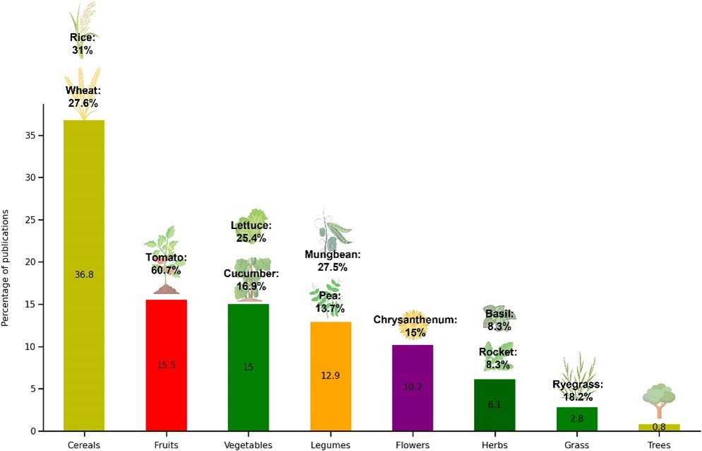 توزیع مطالعات مربوط به کاربرد ریزجلبک ها در کشاورزی، توسط گیاهان هدف